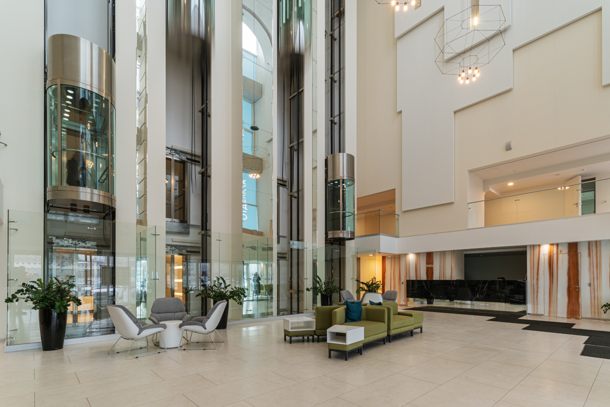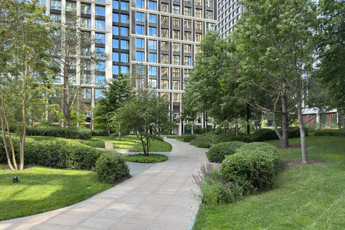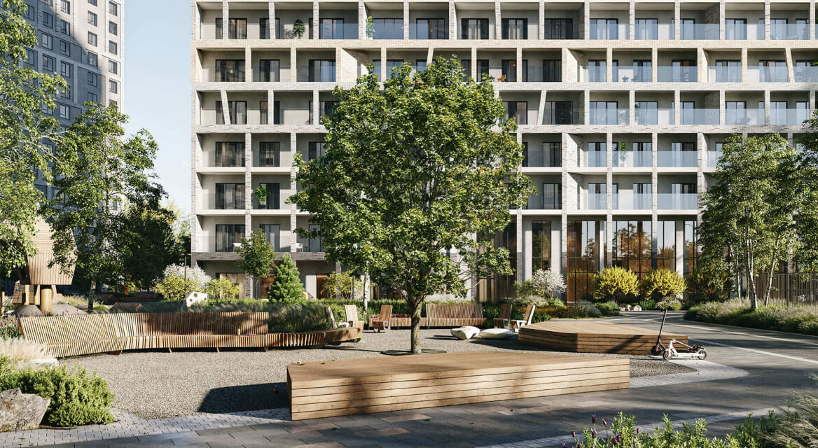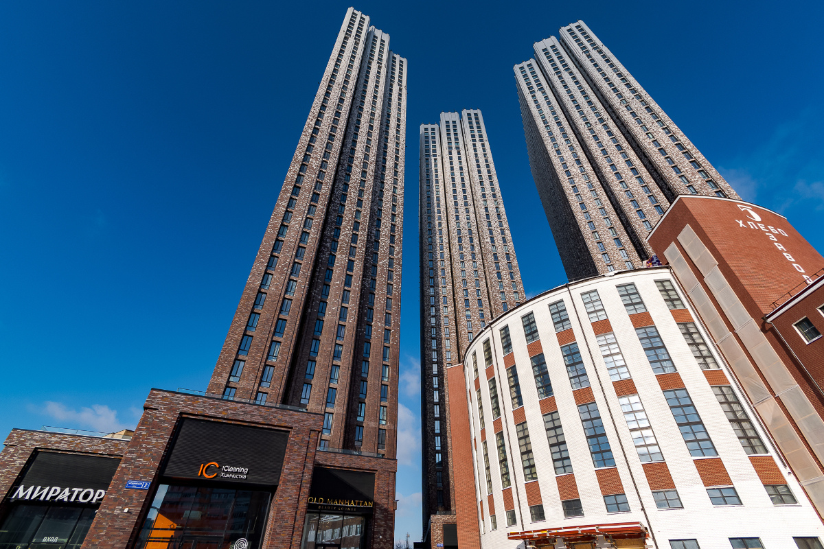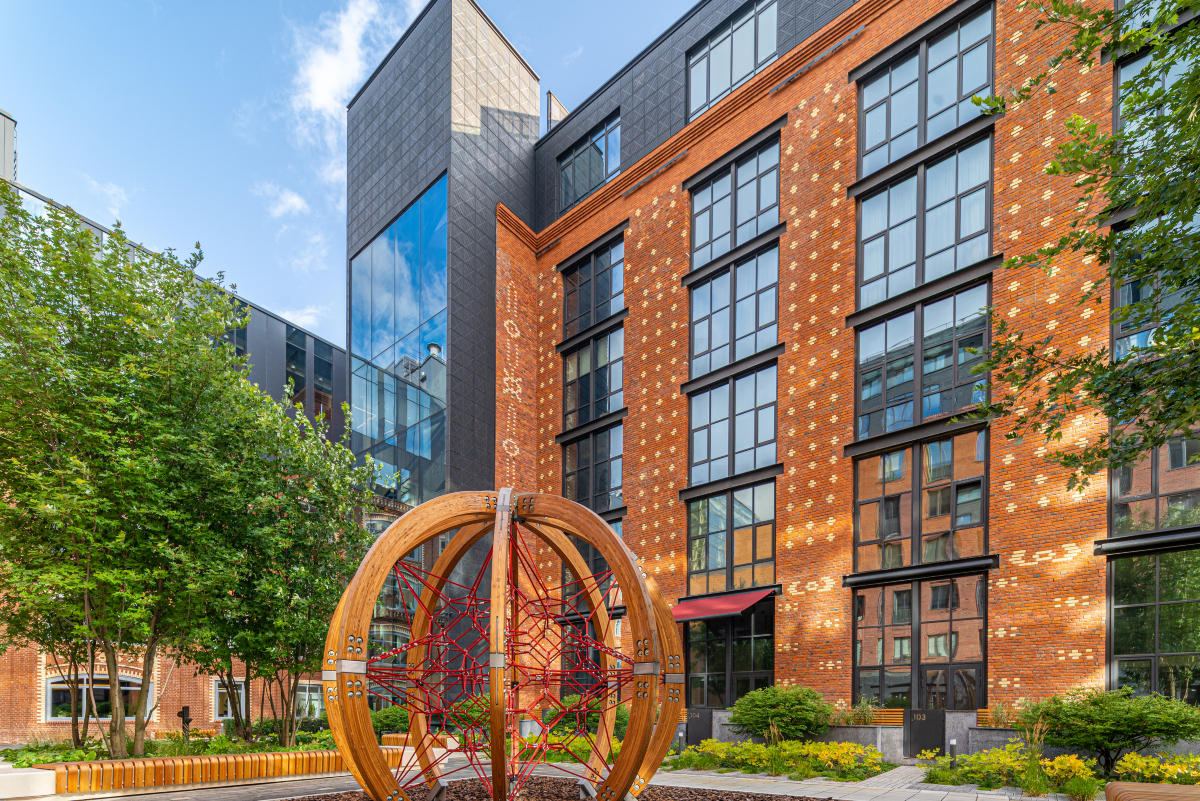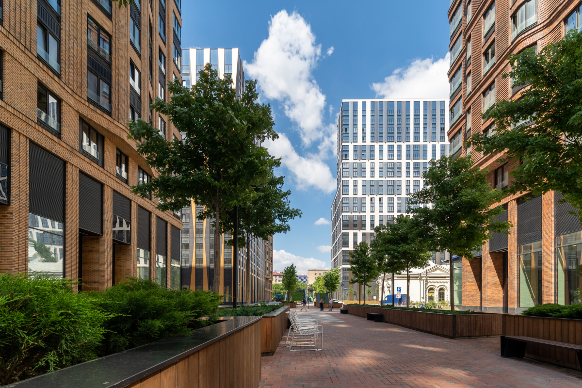 В светлых лобби с 9-метровыми потолками дежурит консьерж-сервис. Открыта торговая галерея — не выходя за пределы комплекса можно купить продукты в минимаркете или поужинать семьей в кафе. Подземный паркинг позволил создать концепцию «двор без машин», юные жители могут спокойно гулять и играть на оборудованной детской площадке. Внутренняя территория поднята над уровнем и занимает крышу стилобата — сюда не заглянут случайные прохожие. Под открытым небом летними вечерами открыт показ кинофильмов. Для жителей дома разработали единое мобильное приложение — управлять домашними устройствами, открыть шлагбаум на парковке или связаться с управляющей компанией теперь можно нажатия одной клавиши.