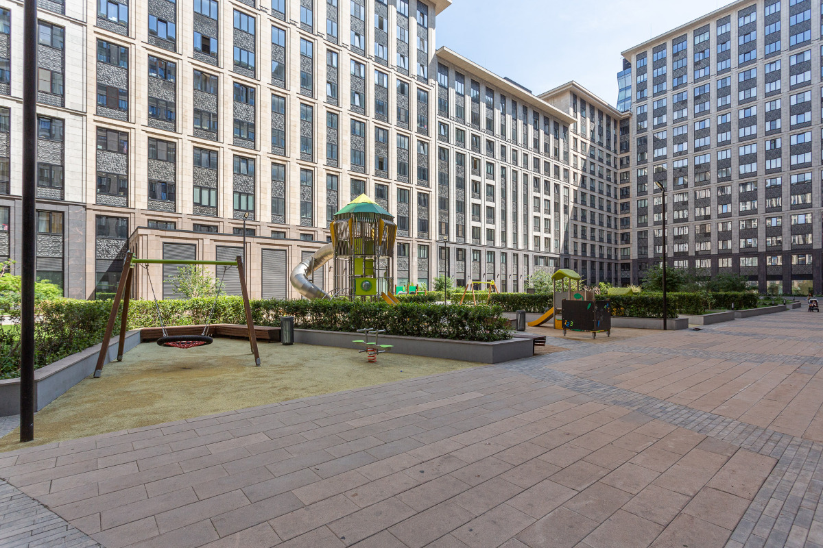 В светлых лобби с 9-метровыми потолками дежурит консьерж-сервис. Открыта торговая галерея — не выходя за пределы комплекса можно купить продукты в минимаркете или поужинать семьей в кафе. Подземный паркинг позволил создать концепцию «двор без машин», юные жители могут спокойно гулять и играть на оборудованной детской площадке. Внутренняя территория поднята над уровнем и занимает крышу стилобата — сюда не заглянут случайные прохожие. Под открытым небом летними вечерами открыт показ кинофильмов. Для жителей дома разработали единое мобильное приложение — управлять домашними устройствами, открыть шлагбаум на парковке или связаться с управляющей компанией теперь можно нажатия одной клавиши.